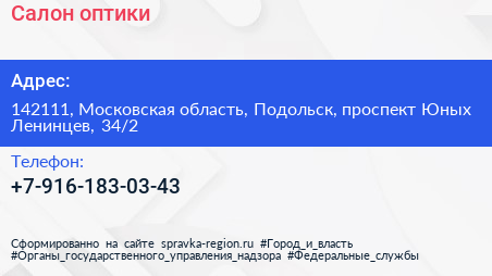 Салон оптики по адресу 142111, Московская область, Подольск, проспект Юных Ленинцев, 34/2 в дальнейшем Организация, размещена в следующих категориях: