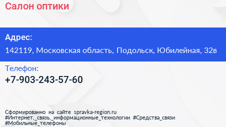 Салон оптики по адресу 142119, Московская область, Подольск, Юбилейная, 32в в дальнейшем Организация, размещена в следующих категориях: