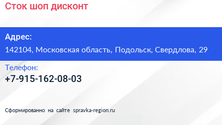Сток-шоп, дисконт по адресу 142104, Московская область, Подольск, Свердлова, 29 в дальнейшем Организация, размещена в следующих категориях: