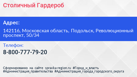 Столичный Гардероб по адресу 142116, Московская область, Подольск, Революционный проспект, 50/34 в дальнейшем Организация, размещена в следующих категориях: