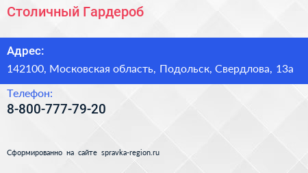 Столичный Гардероб по адресу 142100, Московская область, Подольск, Свердлова, 13а в дальнейшем Организация, размещена в следующих категориях: