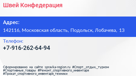 Швей Конфедерация по адресу 142116, Московская область, Подольск, Лобачева, 13 в дальнейшем Организация, размещена в следующих категориях: