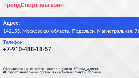 ТрендСпорт, магазин по адресу 142155, Московская область, Подольск, Магистральная, 7а в дальнейшем Организация, размещена в следующих категориях: