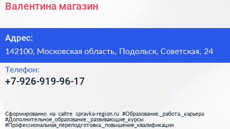 Валентина, магазин по адресу 142100, Московская область, Подольск, Советская, 24 в дальнейшем Организация, размещена в следующих категориях: