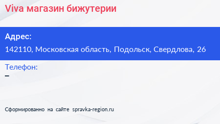 Viva, магазин бижутерии по адресу 142110, Московская область, Подольск, Свердлова, 26 в дальнейшем Организация, размещена в следующих категориях: