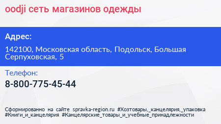 oodji, сеть магазинов одежды по адресу 142100, Московская область, Подольск, Большая Серпуховская, 5 в дальнейшем Организация, размещена в следующих категориях: