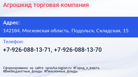 Агрошкид, торговая компания по адресу 142184, Московская область, Подольск, Складская, 15 в дальнейшем Организация, размещена в следующих категориях: