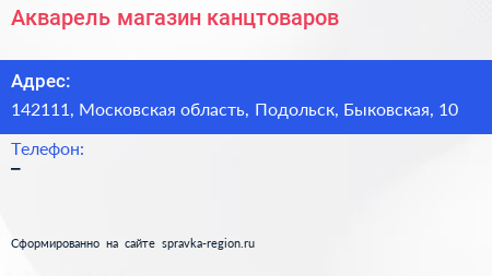 Акварель, магазин канцтоваров по адресу 142111, Московская область, Подольск, Быковская, 10 в дальнейшем Организация, размещена в следующих категориях: