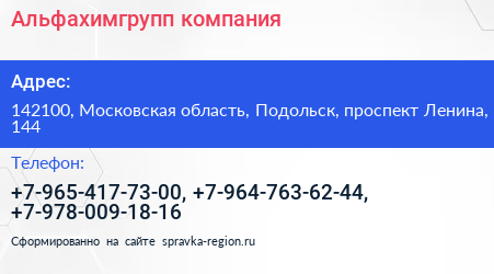 Альфахимгрупп, компания по адресу 142100, Московская область, Подольск, проспект Ленина, 144 в дальнейшем Организация, размещена в следующих категориях: