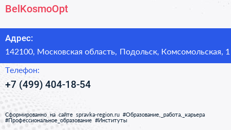 BelKosmoOpt по адресу 142100, Московская область, Подольск, Комсомольская, 1 в дальнейшем Организация, размещена в следующих категориях: