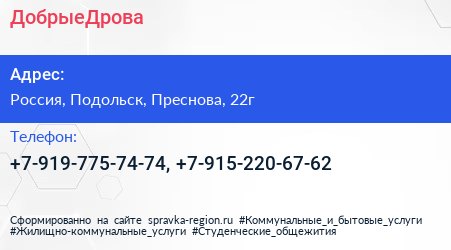 ДобрыеДрова по адресу Церковь Николая Чудотворца, с22А, улица Имени В.Д. Преснова, Домодедово, городской округ Домодедово, Московская область, Центральный федеральный округ, 142029, Россия в дальнейшем Организация, размещена в следующих категориях: