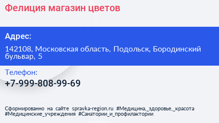 Фелиция, магазин цветов по адресу 142108, Московская область, Подольск, Бородинский бульвар, 5 в дальнейшем Организация, размещена в следующих категориях: