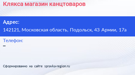 Клякса, магазин канцтоваров по адресу 142121, Московская область, Подольск, 43 Армии, 17а в дальнейшем Организация, размещена в следующих категориях: