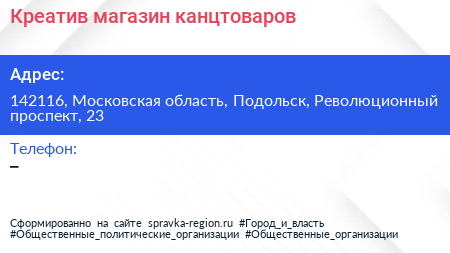 Креатив, магазин канцтоваров по адресу 142116, Московская область, Подольск, Революционный проспект, 23 в дальнейшем Организация, размещена в следующих категориях: