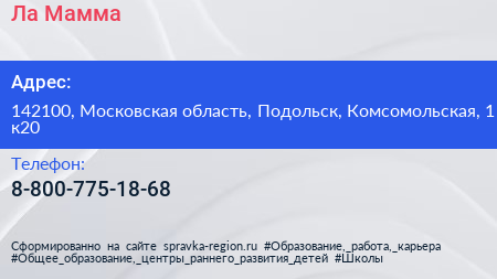 Ла Мамма по адресу 142100, Московская область, Подольск, Комсомольская, 1 к20 в дальнейшем Организация, размещена в следующих категориях:
