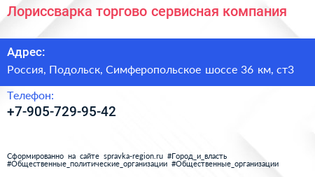 Лориссварка, торгово-сервисная компания по адресу Строительный рынок "Покров", Симферопольское шоссе (дублёр), Сельхозтехника, городской округ Подольск, Московская область, Центральный федеральный округ, 142116, Россия в дальнейшем Организация, размещена в следующих категориях: