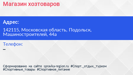 Магазин хозтоваров по адресу 142115, Московская область, Подольск, Машиностроителей, 44а в дальнейшем Организация, размещена в следующих категориях:
