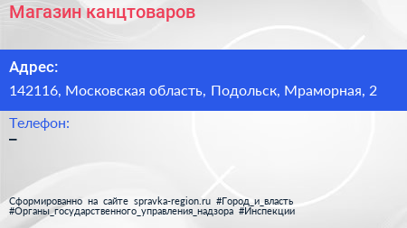 Магазин канцтоваров по адресу 142116, Московская область, Подольск, Мраморная, 2 в дальнейшем Организация, размещена в следующих категориях: