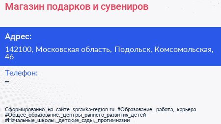 Магазин подарков и сувениров по адресу 142100, Московская область, Подольск, Комсомольская, 46 в дальнейшем Организация, размещена в следующих категориях: