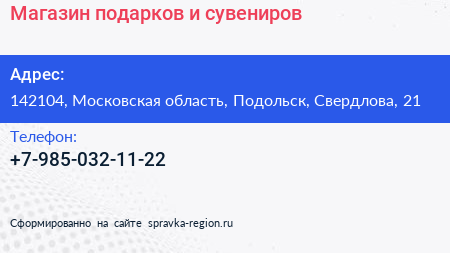 Магазин подарков и сувениров по адресу 142104, Московская область, Подольск, Свердлова, 21 в дальнейшем Организация, размещена в следующих категориях: