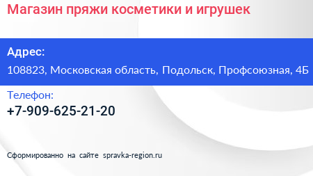Магазин пряжи, косметики и игрушек по адресу 108823, Московская область, Подольск, Профсоюзная, 4Б в дальнейшем Организация, размещена в следующих категориях: