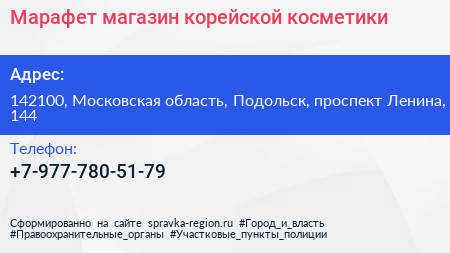 Марафет, магазин корейской косметики по адресу 142100, Московская область, Подольск, проспект Ленина, 144 в дальнейшем Организация, размещена в следующих категориях: