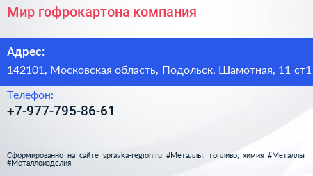 Мир гофрокартона, компания по адресу 142101, Московская область, Подольск, Шамотная, 11 ст1 в дальнейшем Организация, размещена в следующих категориях: