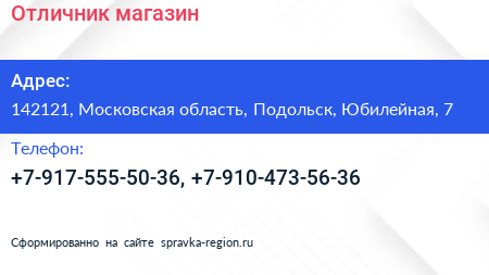 Отличник, магазин по адресу 142121, Московская область, Подольск, Юбилейная, 7 в дальнейшем Организация, размещена в следующих категориях: