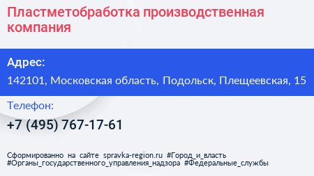 Пластметобработка, производственная компания по адресу 142101, Московская область, Подольск, Плещеевская, 15 в дальнейшем Организация, размещена в следующих категориях: