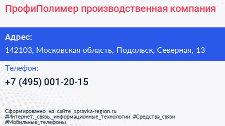 ПрофиПолимер, производственная компания по адресу 142103, Московская область, Подольск, Северная, 13 в дальнейшем Организация, размещена в следующих категориях: