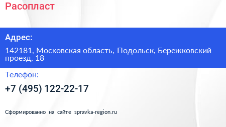 Расопласт по адресу 142181, Московская область, Подольск, Бережковский проезд, 18 в дальнейшем Организация, размещена в следующих категориях: