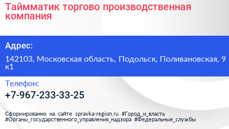 Таймматик, торгово-производственная компания по адресу 142103, Московская область, Подольск, Поливановская, 9 к1 в дальнейшем Организация, размещена в следующих категориях: