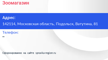 Зоомагазин по адресу 142114, Московская область, Подольск, Ватутина, 81 в дальнейшем Организация, размещена в следующих категориях: