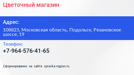 Цветочный магазин по адресу 108823, Московская область, Подольск, Рязановское шоссе, 19 в дальнейшем Организация, размещена в следующих категориях: