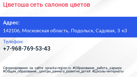 Цветоша, сеть салонов цветов по адресу 142106, Московская область, Подольск, Садовая, 3 к3 в дальнейшем Организация, размещена в следующих категориях: