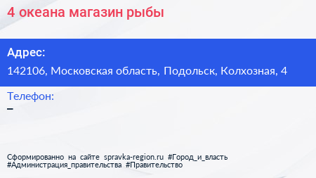 4 океана, магазин рыбы по адресу 142106, Московская область, Подольск, Колхозная, 4 в дальнейшем Организация, размещена в следующих категориях: