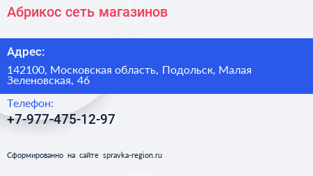 Абрикос, сеть магазинов по адресу 142100, Московская область, Подольск, Малая Зеленовская, 46 в дальнейшем Организация, размещена в следующих категориях: