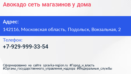 Авокадо, сеть магазинов у дома по адресу 142116, Московская область, Подольск, Вокзальная, 2 в дальнейшем Организация, размещена в следующих категориях: