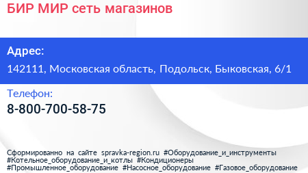 БИР МИР, сеть магазинов по адресу 142111, Московская область, Подольск, Быковская, 6/1 в дальнейшем Организация, размещена в следующих категориях: