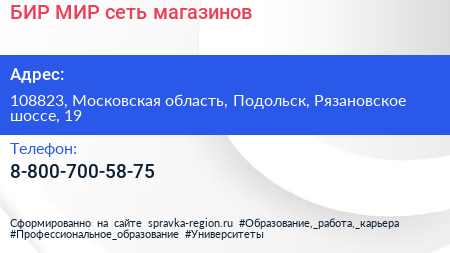 БИР МИР, сеть магазинов по адресу 108823, Московская область, Подольск, Рязановское шоссе, 19 в дальнейшем Организация, размещена в следующих категориях: