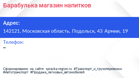 Барабулька, магазин напитков по адресу 142121, Московская область, Подольск, 43 Армии, 19 в дальнейшем Организация, размещена в следующих категориях: