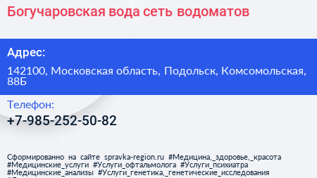 Богучаровская вода, сеть водоматов по адресу 142100, Московская область, Подольск, Комсомольская, 88Б в дальнейшем Организация, размещена в следующих категориях: