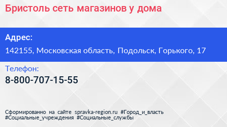 Бристоль, сеть магазинов у дома по адресу 142155, Московская область, Подольск, Горького, 17 в дальнейшем Организация, размещена в следующих категориях: