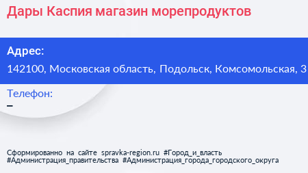 Дары Каспия, магазин морепродуктов по адресу 142100, Московская область, Подольск, Комсомольская, 3 в дальнейшем Организация, размещена в следующих категориях:
