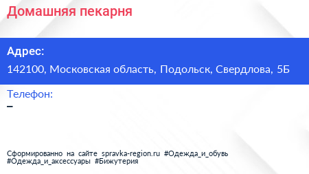 Домашняя пекарня по адресу 142100, Московская область, Подольск, Свердлова, 5Б в дальнейшем Организация, размещена в следующих категориях:
