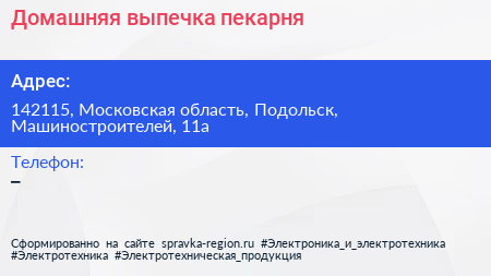 Домашняя выпечка, пекарня по адресу 142115, Московская область, Подольск, Машиностроителей, 11а в дальнейшем Организация, размещена в следующих категориях: