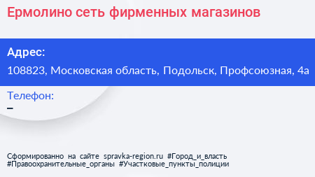 Ермолино, сеть фирменных магазинов по адресу 108823, Московская область, Подольск, Профсоюзная, 4а в дальнейшем Организация, размещена в следующих категориях: