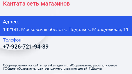 Кантата, сеть магазинов по адресу 142181, Московская область, Подольск, Молодёжная, 11 в дальнейшем Организация, размещена в следующих категориях: