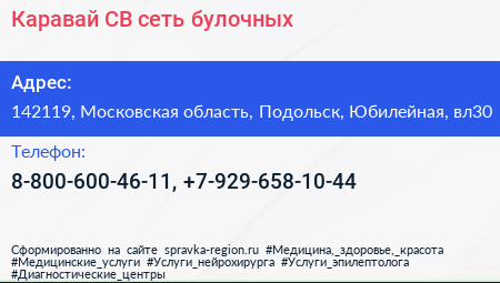 Каравай СВ, сеть булочных по адресу 142119, Московская область, Подольск, Юбилейная, вл30 в дальнейшем Организация, размещена в следующих категориях: