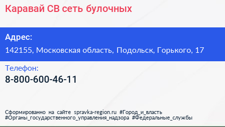 Каравай СВ, сеть булочных по адресу 142155, Московская область, Подольск, Горького, 17 в дальнейшем Организация, размещена в следующих категориях: